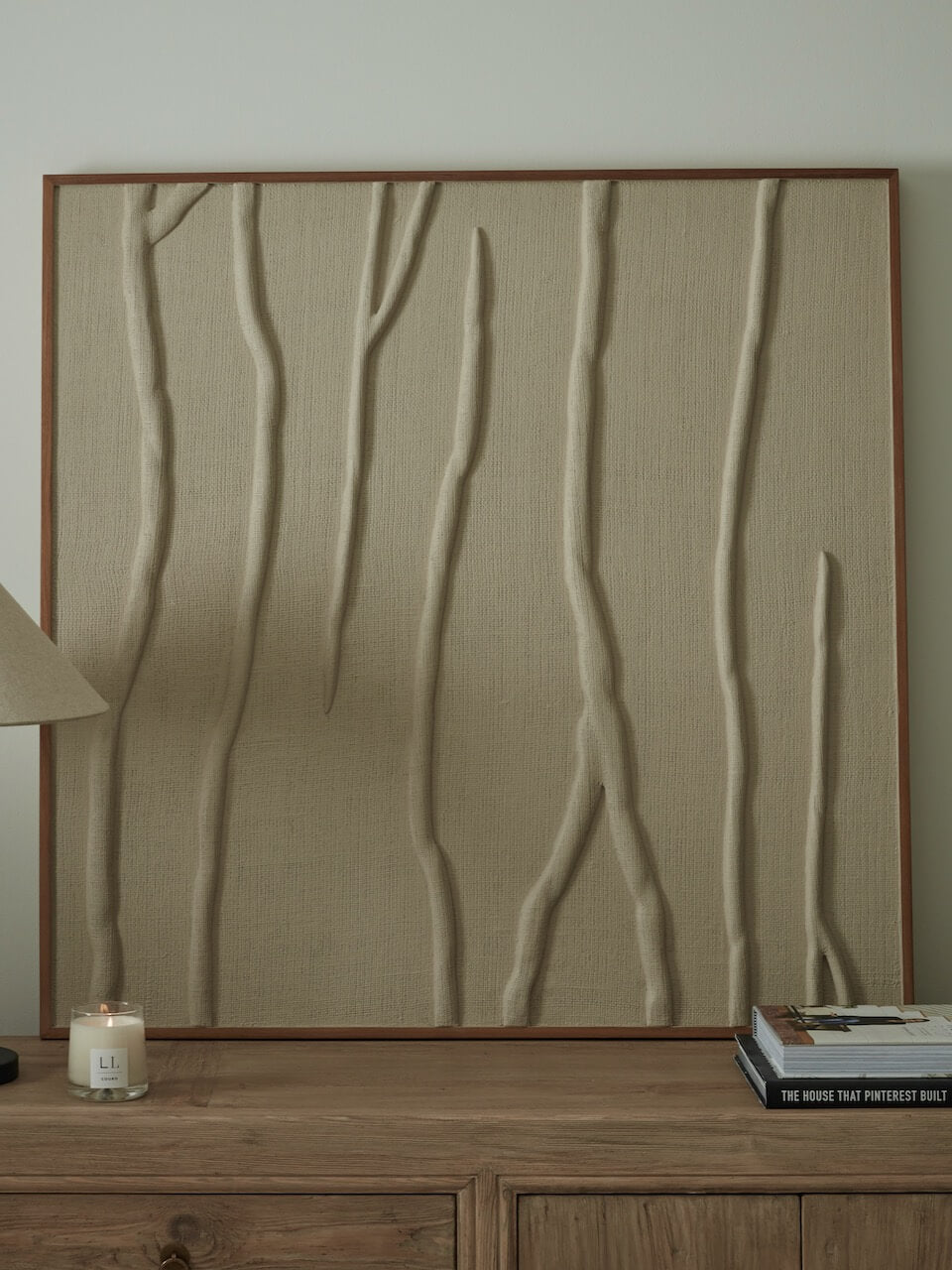 Cette magnifique œuvre d'art murale Raya, réalisée à la main avec soin, est réalisée en jute naturel pour créer un délicat motif de branches. Sa finition aux tons neutres confère à cette pièce un caractère à la fois intemporel et élégant. Son cadre en bois offert rehausse sa qualité. Accrochez-la à l'aide des crochets pré-montés ou posez-la contre votre console pour un look plus moderne.